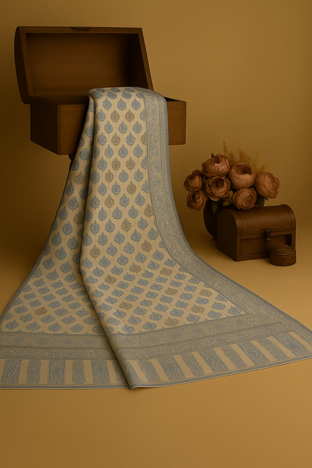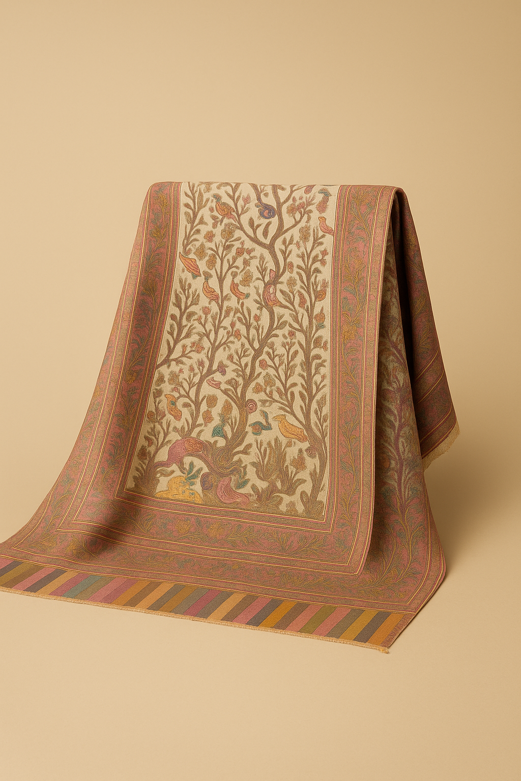 Soft as riverlight over desert stone, this pashmina shawl blends beige, pale blue, and a golden whisper — a tribute to Isfahan’s sacred river, echoing timeless stories, carrying heritage, and reflecting luminous calm across generations.