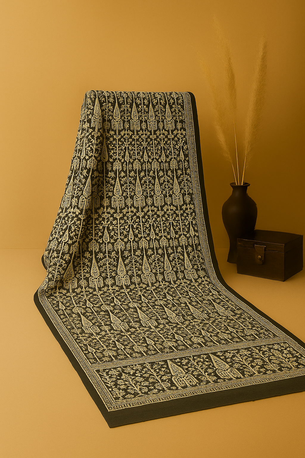 A shawl of quiet strength and soft twilight. Handwoven in earthy olive tones, it whispers of heritage and grace, carrying warmth, tradition, and the calm of evening skies.