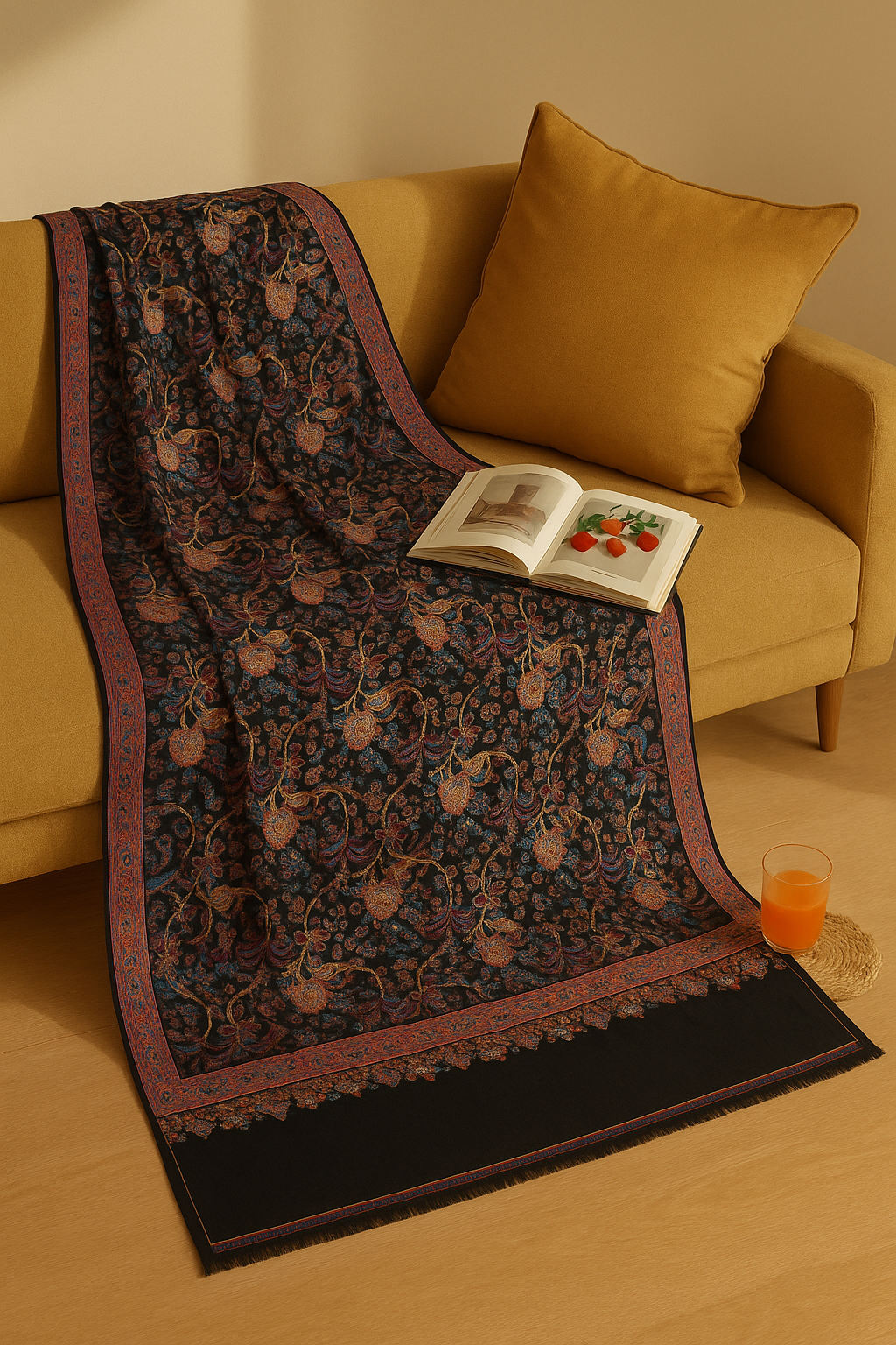 Black as sacred stone, adorned in ivory motifs — this pashmina shawl evokes the silent beauty of Ardabil’s shrine domes. A tear in silk, a whisper in timeless thread.