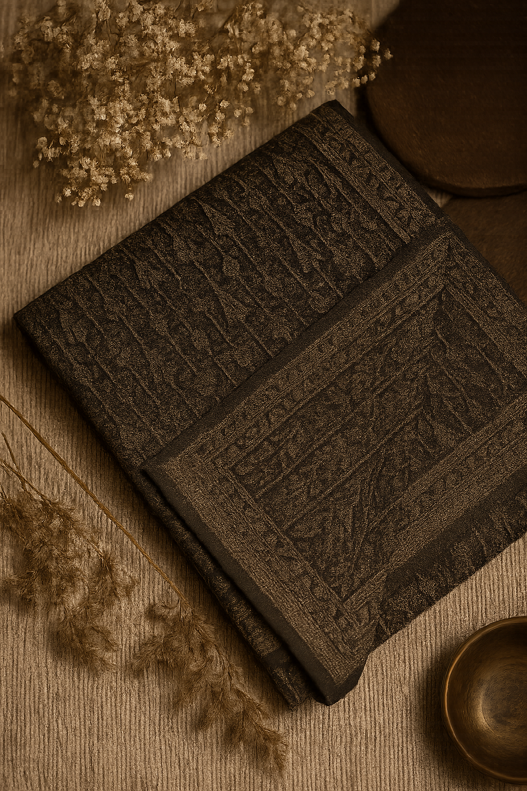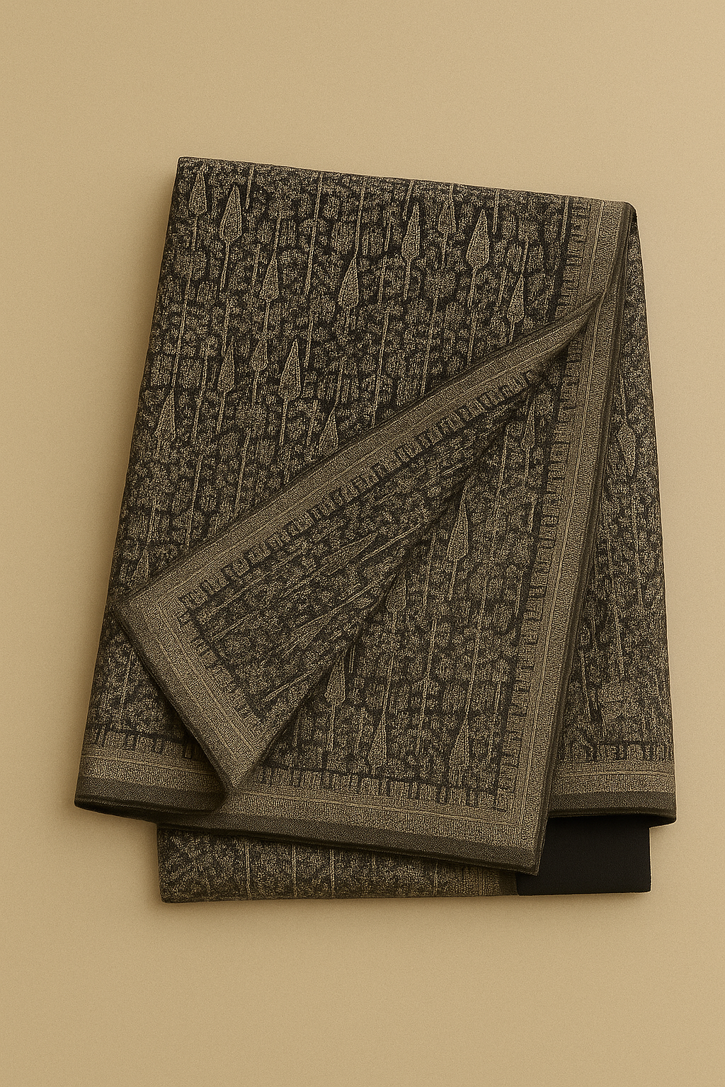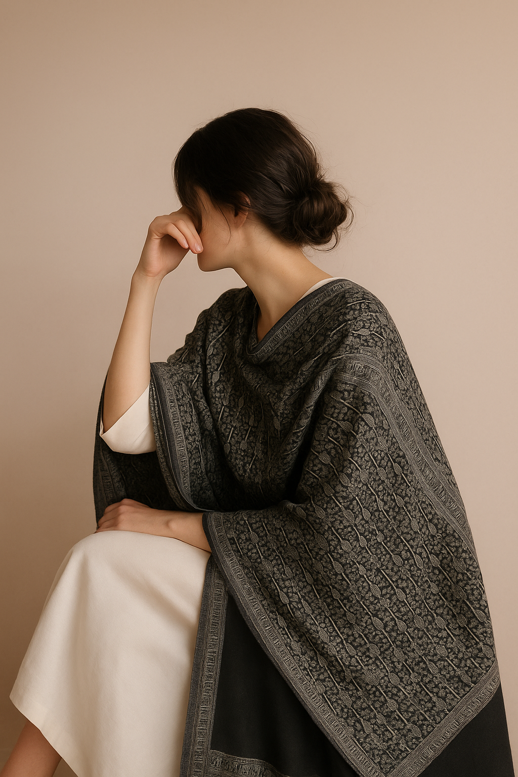 Woven from the purest Kashmiri pashmina in the ancient Kani technique, Ashk of Ardabil is a monochrome symphony of emotion. The black canvas recalls sacred stone and silent halls, while white patterns rise like prayers etched in air. Measuring 120 × 230 cm, this shawl flows with grace — featherlight, warm, and profoundly elegant. More than a garment, it is a tear woven in reverence, a tribute to sorrow made sublime.