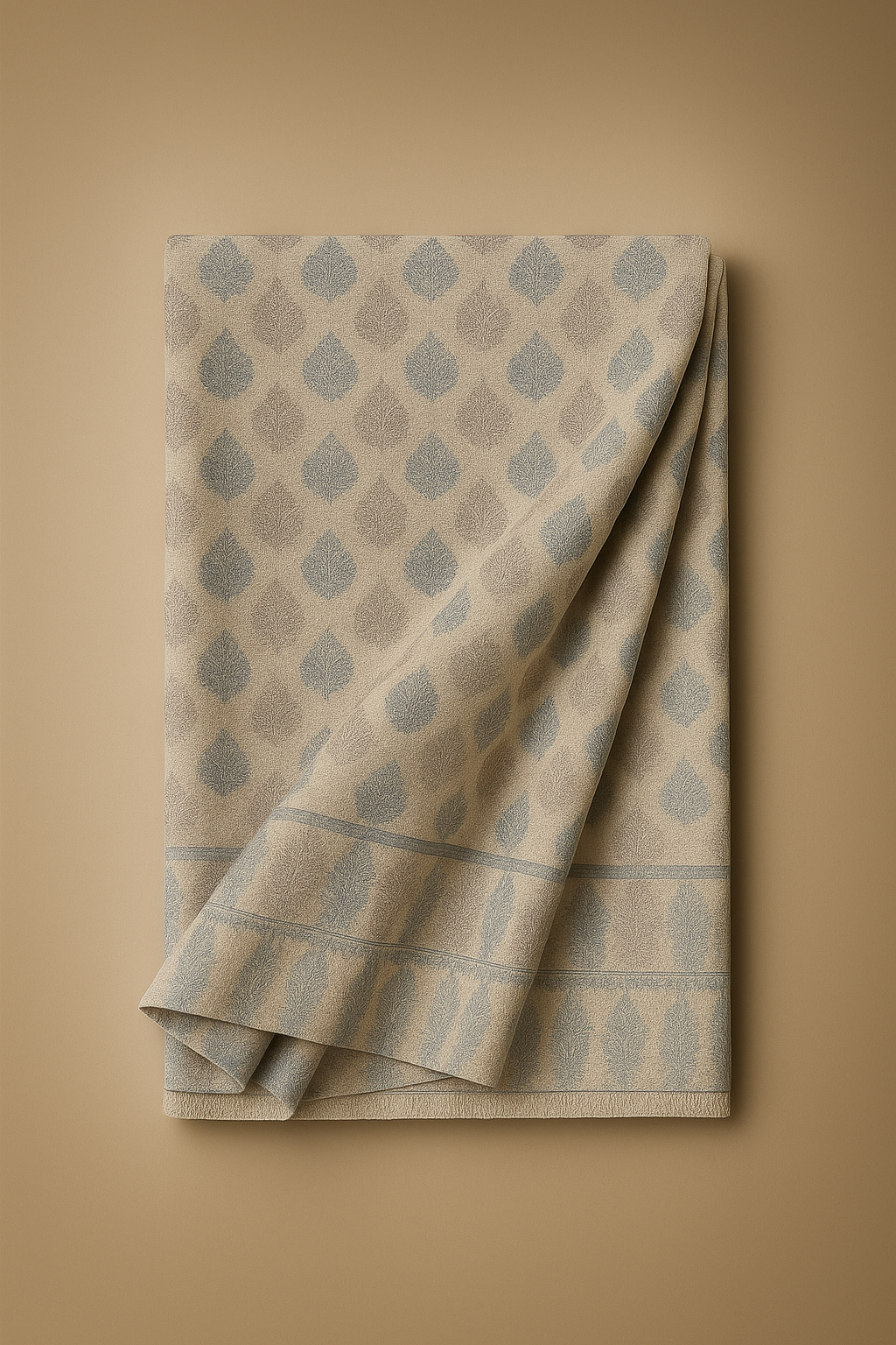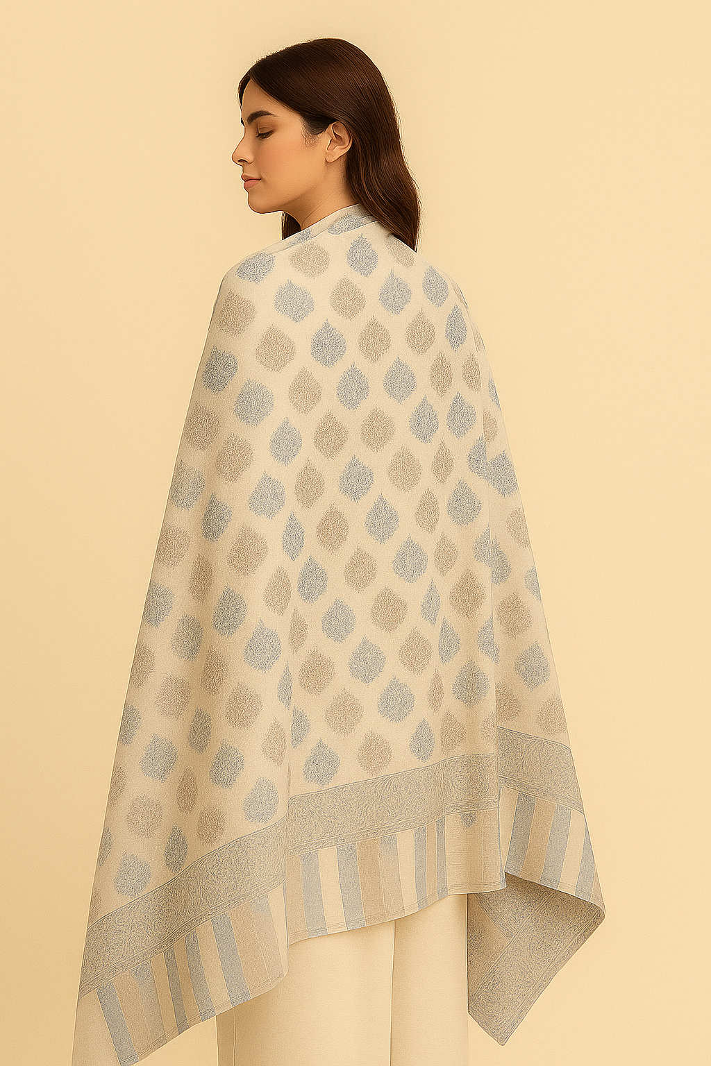 Woven in the noble Kani tradition using 100% Kashmiri pashmina, this shawl measures 120 × 230 cm — flowing like water, weightless yet warm. It is not merely a piece of cloth; it is light captured in thread, a river of silence and grace.